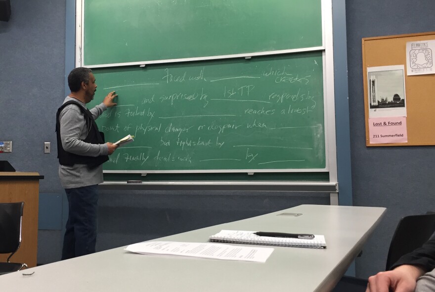 Just after 4 p.m. on Tuesday, the 25 or so students who had enrolled in Willmott's Intermediate Screenwriting class were waiting in room 426 of Summerfield Hall, with tiered rows of seats bolted to the floor. Willmott was carrying the vest when he walked in, and the chatter grew quiet as he started to strap it on.