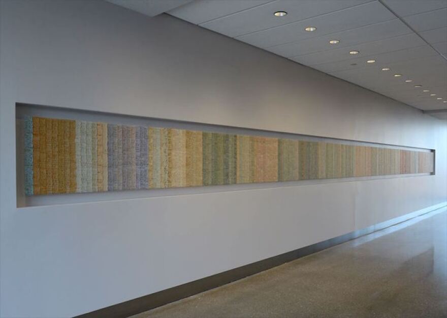 Her piece for the Health Education Building takes advantage of the fact that the medical center's Clendening Library contains nearly 40 letters from Florence Nightengale, the founder of modern nursing. "For FN ... words without fear" uses images of Nightingale's handwritten letters on a 40-foot, horizontal timeline distinguished by handwriting and color.
