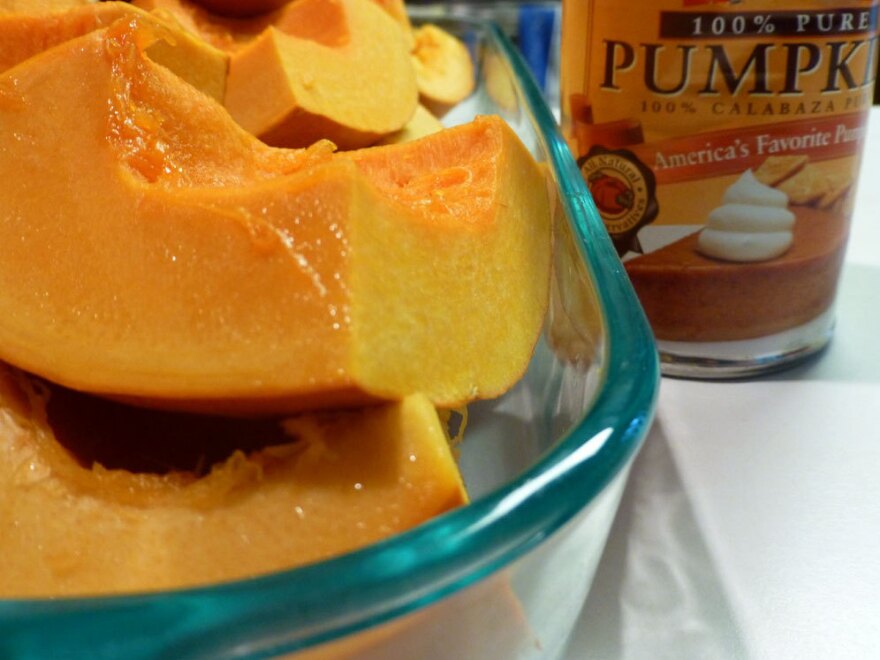 Of all the recipes used on Thanksgiving, this is the one that sends many cooks reaching for the can. Canned pumpkin puree is easy, cheap and, if you find a good quality version, it's tough to tell that it came from a can. But there is something about doing it yourself that makes it all taste so much better. To be there to chop the pumpkin, roast it and puree it is to put yourself into the dish. I use a classic recipe from Mark Bittman's bookHow to Cook Everything (Wiley 2003). I varied the recipe to roast the pumpkin instead of boiling it, because I find that roasting vegetables brings out a natural sweetness.