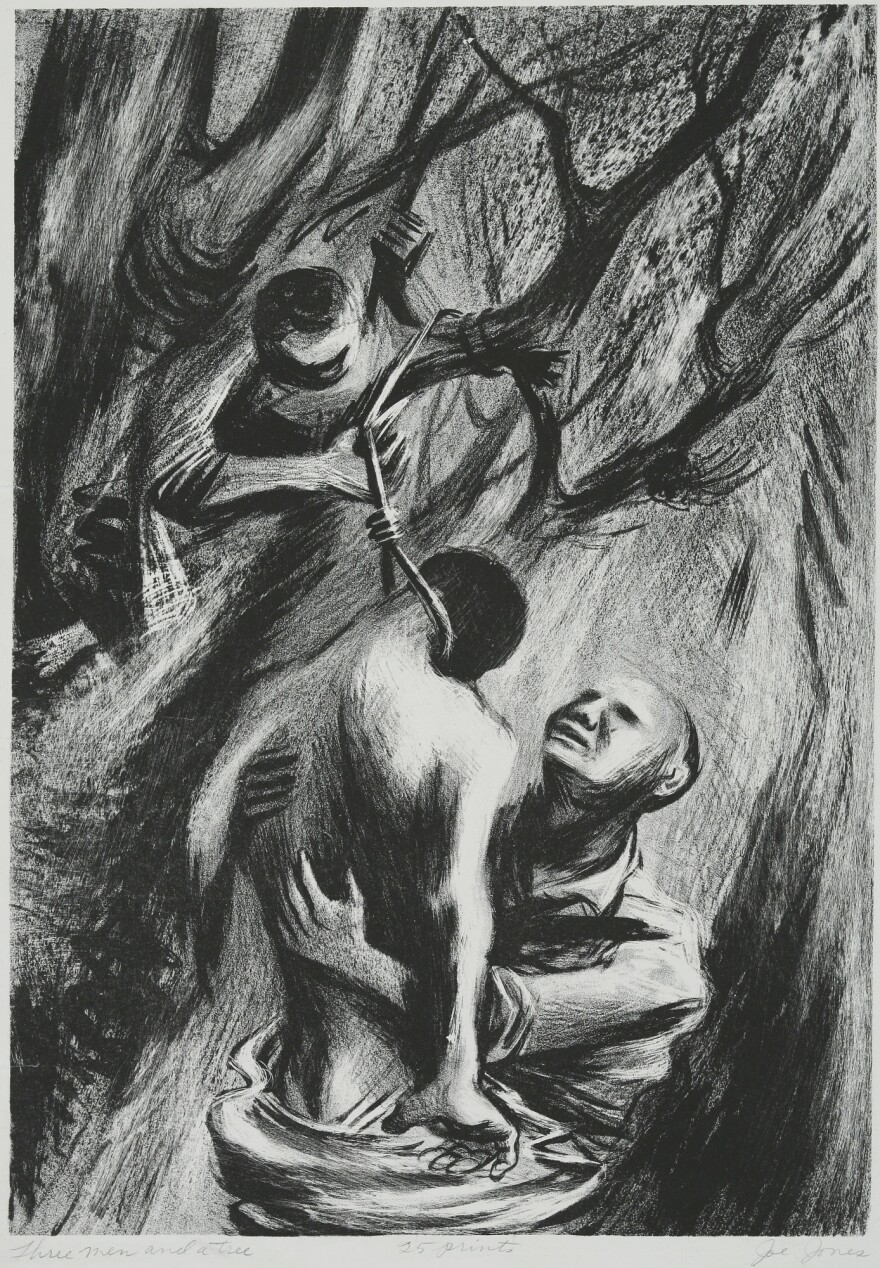 A few walls away is a more intense work of social commentary. "Three Men and a Tree," from 1937, is a black and white lithograph of a lynching scene. A father pulling his son down from a tree.
