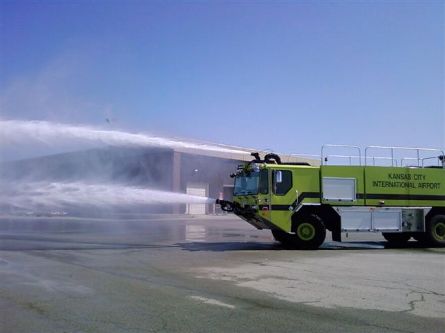 Right next to KCI on the former TWA overhaul base, there is a boneyard of old planes, parts of them on pavement. One is an engineless 727 jet and airport Fire Chief Matt Mauer has just had a special crash truck spray it down with fire suppressing foam.