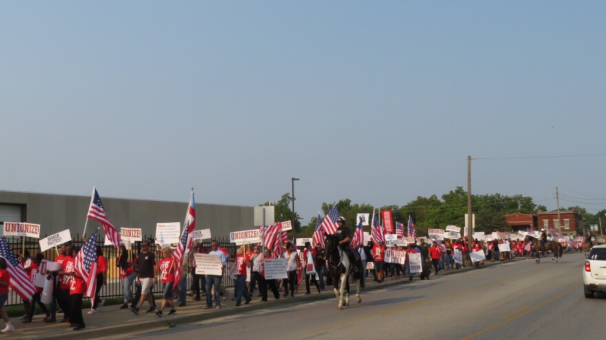 Several hundred Kansas City-area fast-food workers, along with members of labor unions, clergy and their supporters, started Labor Day with an early morning rally on the grassy lawn at 33rd and Southwest Trafficway, stressing their demand for $15 an hour and union rights.