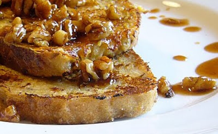 Warm the syrup in a sauce pan with the bourbon, cinnamon, and pecans. Top the toast with syrup. Enjoy.