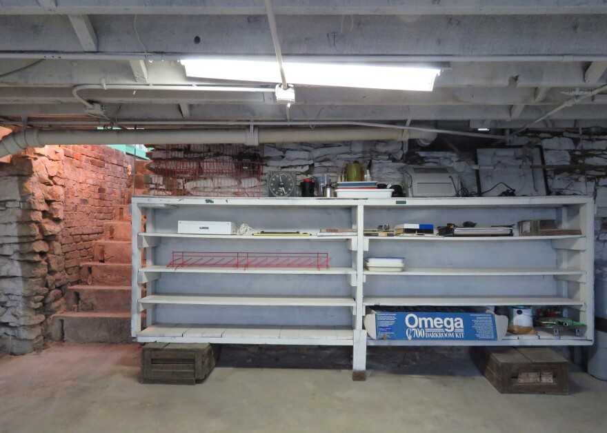The basement at Night Blooms is wide open, reserved for studio space. But Hanson is using shelves for supplies she's collected for the darkroom. There are glow-in-the-dark timers designed for darkrooms, old film canisters for developing film rolls, and a collection of beakers and trays for the chemicals used to make prints from the negatives.